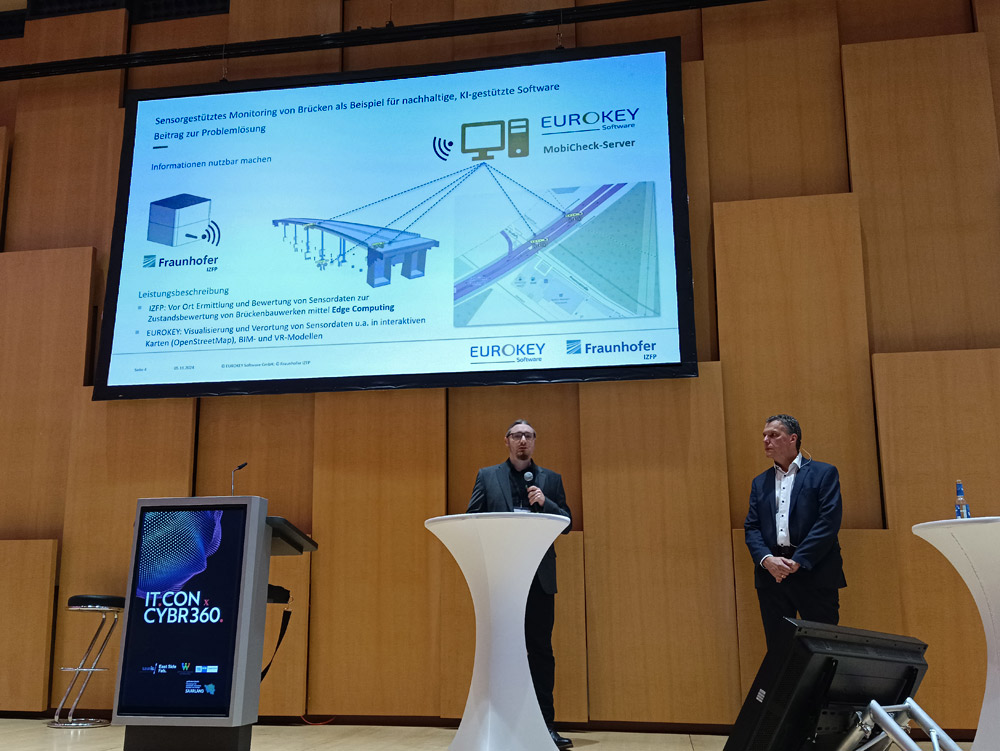 Neben einem Stand-Besuch stieß auch der Vortrag von Dirk Koster, Chief Scientist am Fraunhofer IZFP und EUROKEY Geschäftsführer Ludwig Kuhn über das wichtige Thema Brücken-Monitoring trotz der relativ späten Stunde auf reges Interesse.