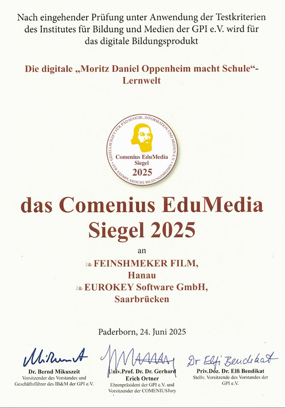 Comenius EduMedia Siegel für „Moritz Daniel Oppenheim macht Schule“